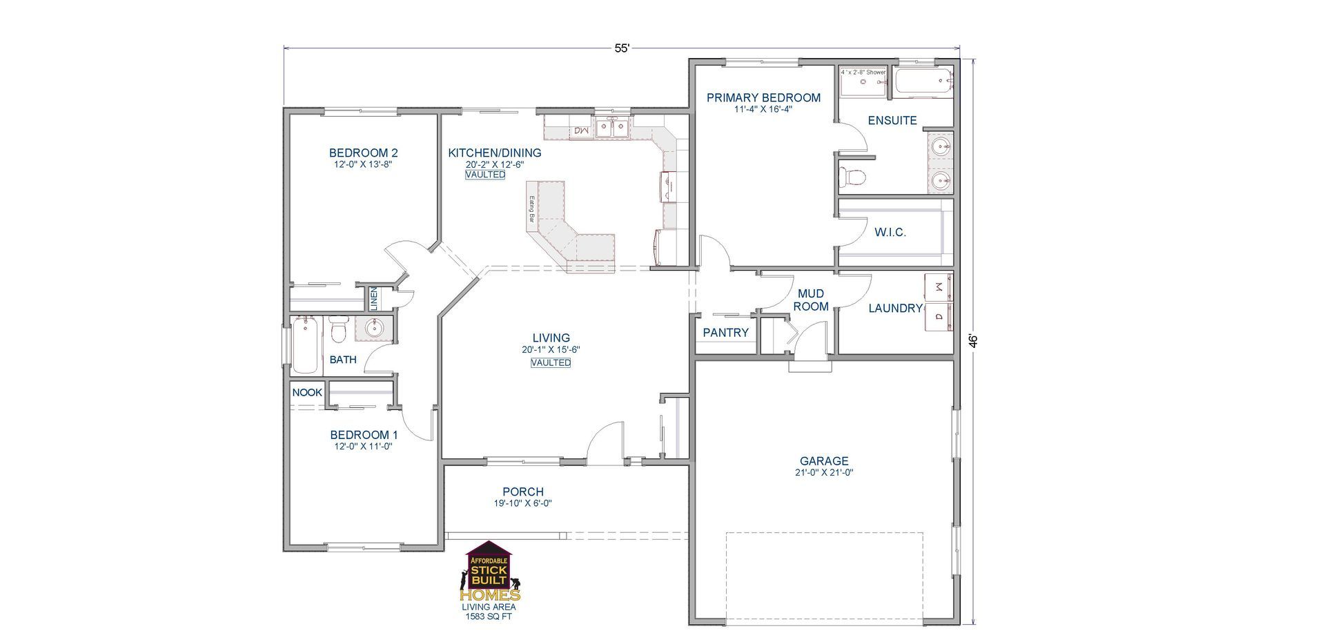 The 1583 plan is a mid-size home that makes the most of its one story layout. The open kitchen looks into the spacious living room and formal dining area under vaulted ceilings, providing abundant room for relaxation.