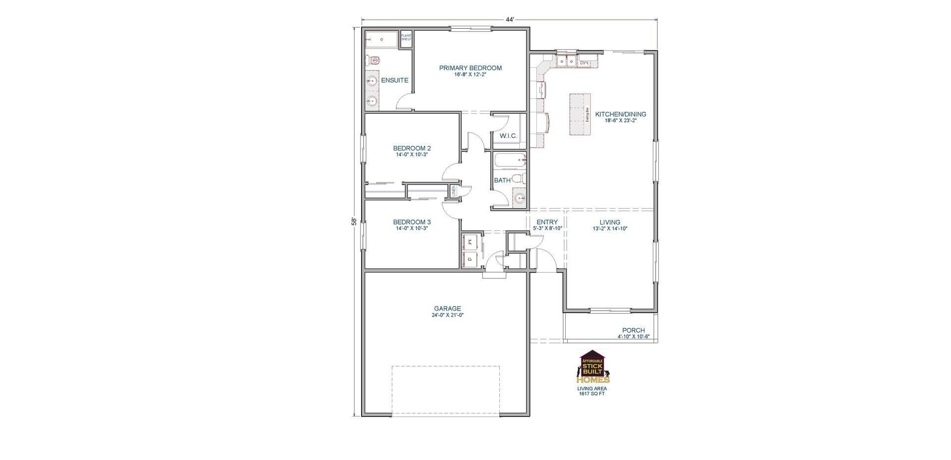 The 1617 plan features three bedrooms, two bathrooms and a great room. The plan also has a spacious master suite with a dual vanity and walk in closet. A high quality, well designed and affordable home just right for you!
